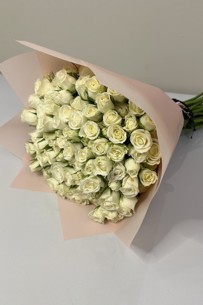 تجمع هذه الباقة بين بساطة اللون الأبيض وجاذبية التغليف الوردي، مما يجعلها هدية مثالية للمناسبات الرومانسية مثل الذكرى السنوية، أو لتعبر عن المشاعر العميقة للأحباء. التغليف الوردي يضفي لمسة من الدفء والحميمية على الباقة، مما يجعلها تبرز بشكل مميز وجذاب.