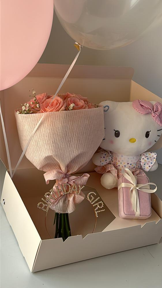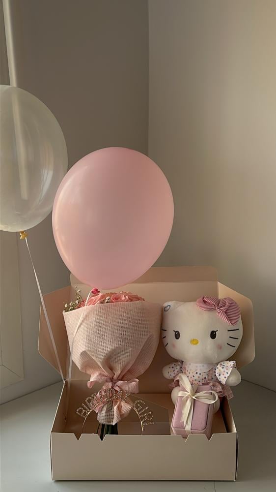 بوكس هيلوكيتي مكون من :ورد جوري وردي بتغليف ورديدمية هيلوكيتي 25 سمسلسال هيلوكيتيطوق بيرثداي2 بالون وردي و شفاف